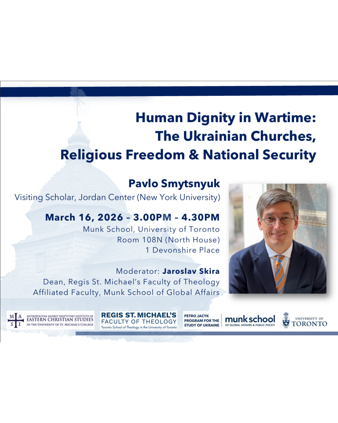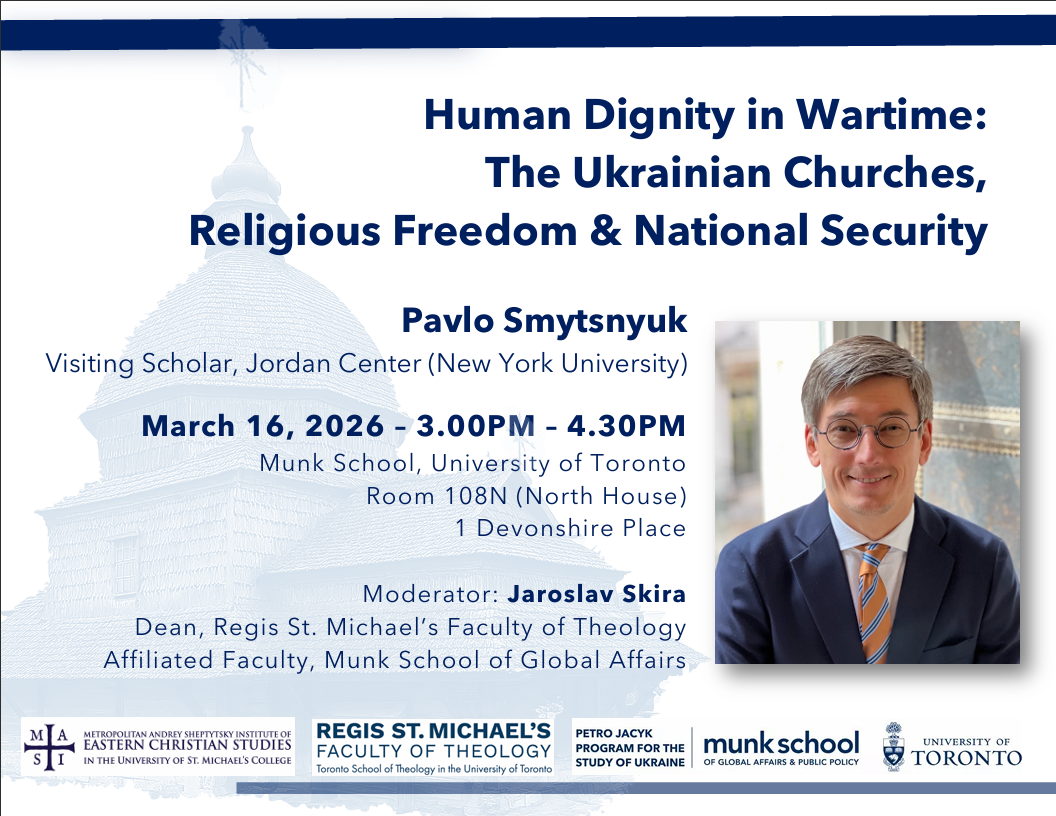 Join us on March 16, 3:00-4:30 PM for "Human Dignity in Wartime: The Ukrainian Churches, Religious Freedom & National Security" with visiting scholar Dr. Pavlo Smytsnyuk.